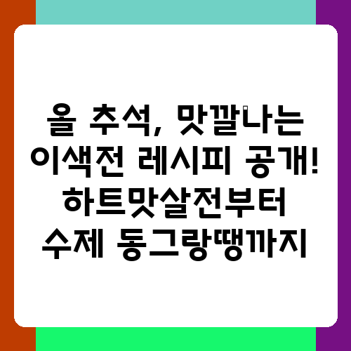 올해 추석에는 흔한 전 부치기에서 벗어나 특별한 전을 만들어보고 싶으세요? 가족들과 함께 즐거운 추억을 만들고, 색다른 맛으로 추석 분위기를 더욱 풍성하게 만들어 줄 이색 전 레시피들을 준비했습니다. 하트 모양 맛살전부터 고급스러운 표고버섯전, 그리고 정성 가득한 수제 동그랑땡 속 만들기까지, 자세한 레시피와 함께 알려드릴게요! 하트 맛살전 만들기 맛살을 활용해서 쉽고 귀엽게 만들 수 있는 하트 맛살전은 아이들이 특히 좋아할 거예요. 냉동 맛살을 사용하면 더욱 간편하게 만들 수 있다는 장점이 있죠. 재료 준비도 간단하고, 모양만 예쁘게 찍어내면 되니까, 요리 초보자도 쉽게 도전할 수 있어요. 하트 모양 틀을 이용하면 더욱 사랑스러운 모양을 만들 수 있고, 맛살의 짭조름한 맛과 고소한 기름에 ..
